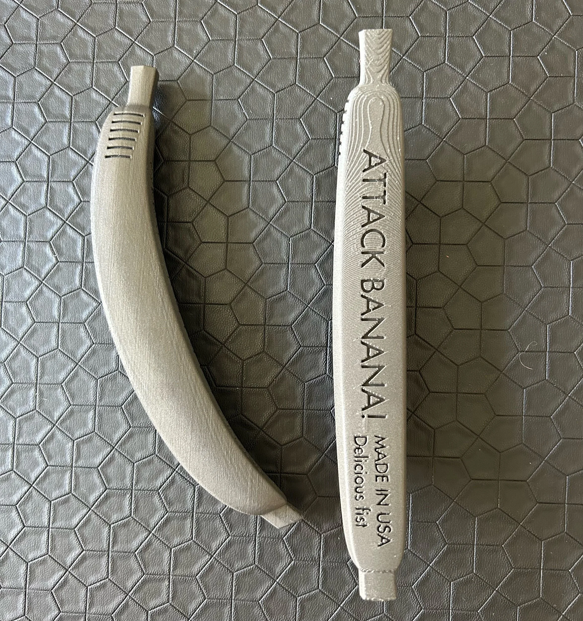 Image 1 of 1 Attack Banana $55.00 sold out Grey. 3D Steel infused filament. 7” in over all length. Weight 4oz Sold Out Added! Grey. 3D Steel infused filament. 7” in over all length. Weight 4oz