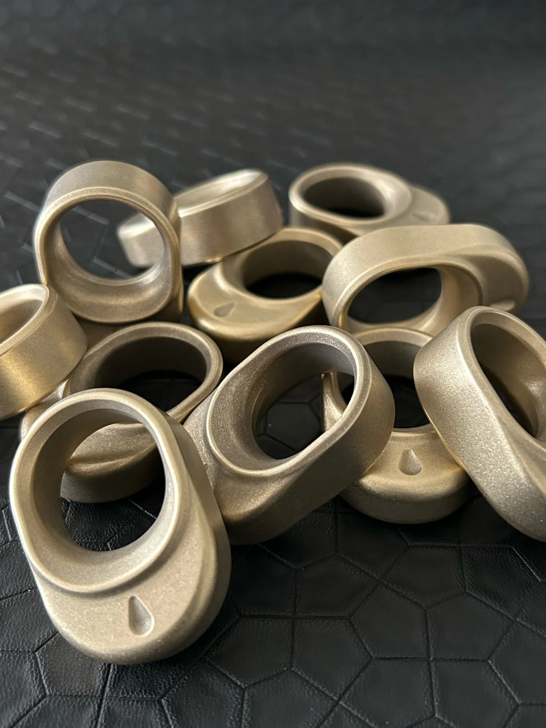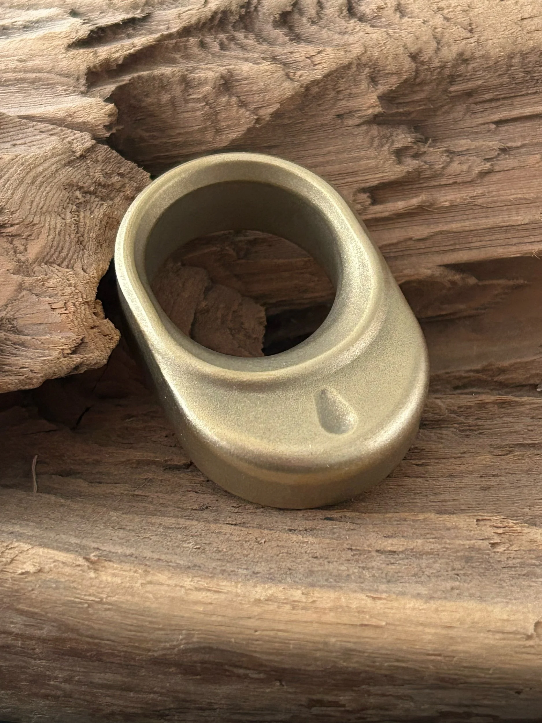 Naval brass. 5/8” thick. 1” ring size with new and heavier contours. Hand sanded, blasted and tumbled. Teardrop icon on bothe sides.
