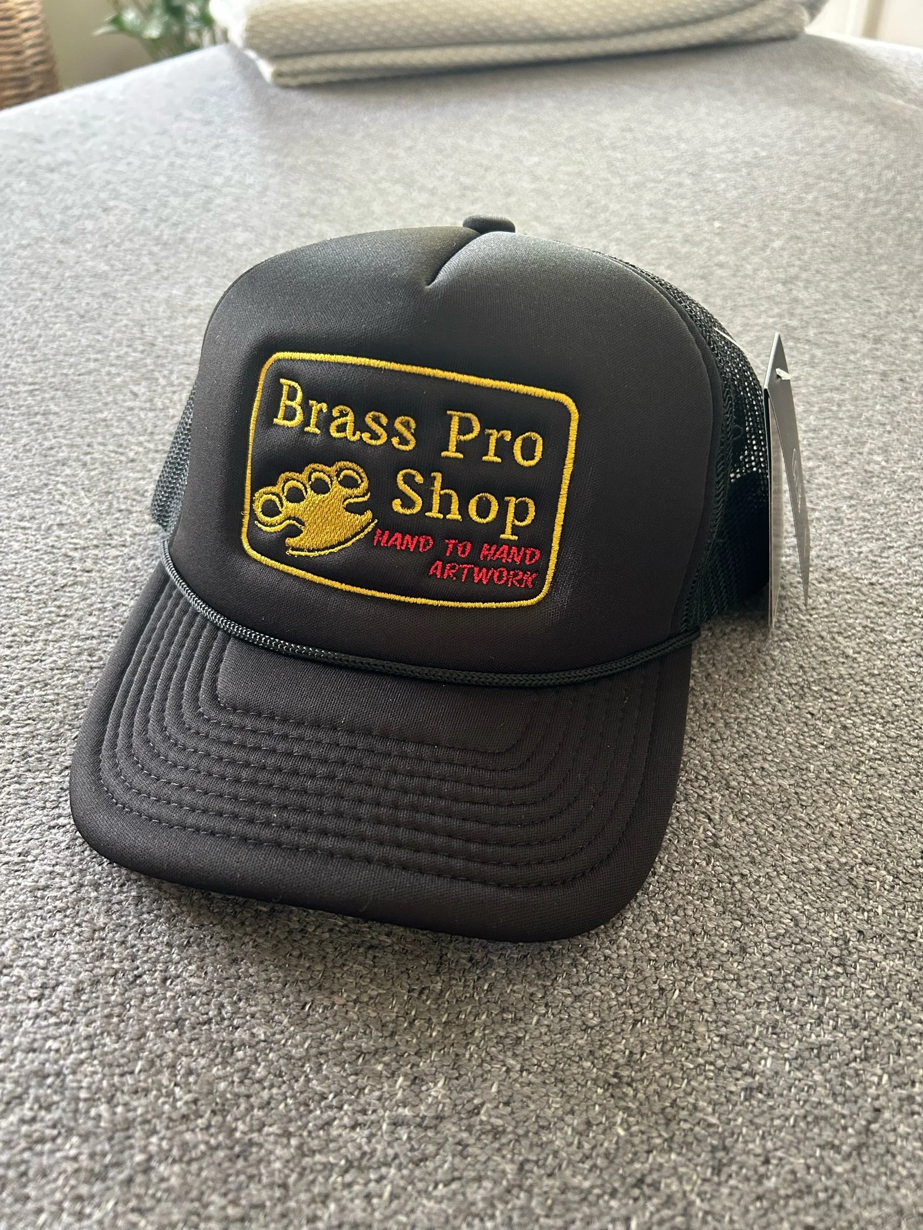 Image 1 of 1 Brass Pro Shop $35.00 Black foam trucker. Mesh back, embroidered. Add To Cart Added! Black foam trucker. Mesh back, embroidered.