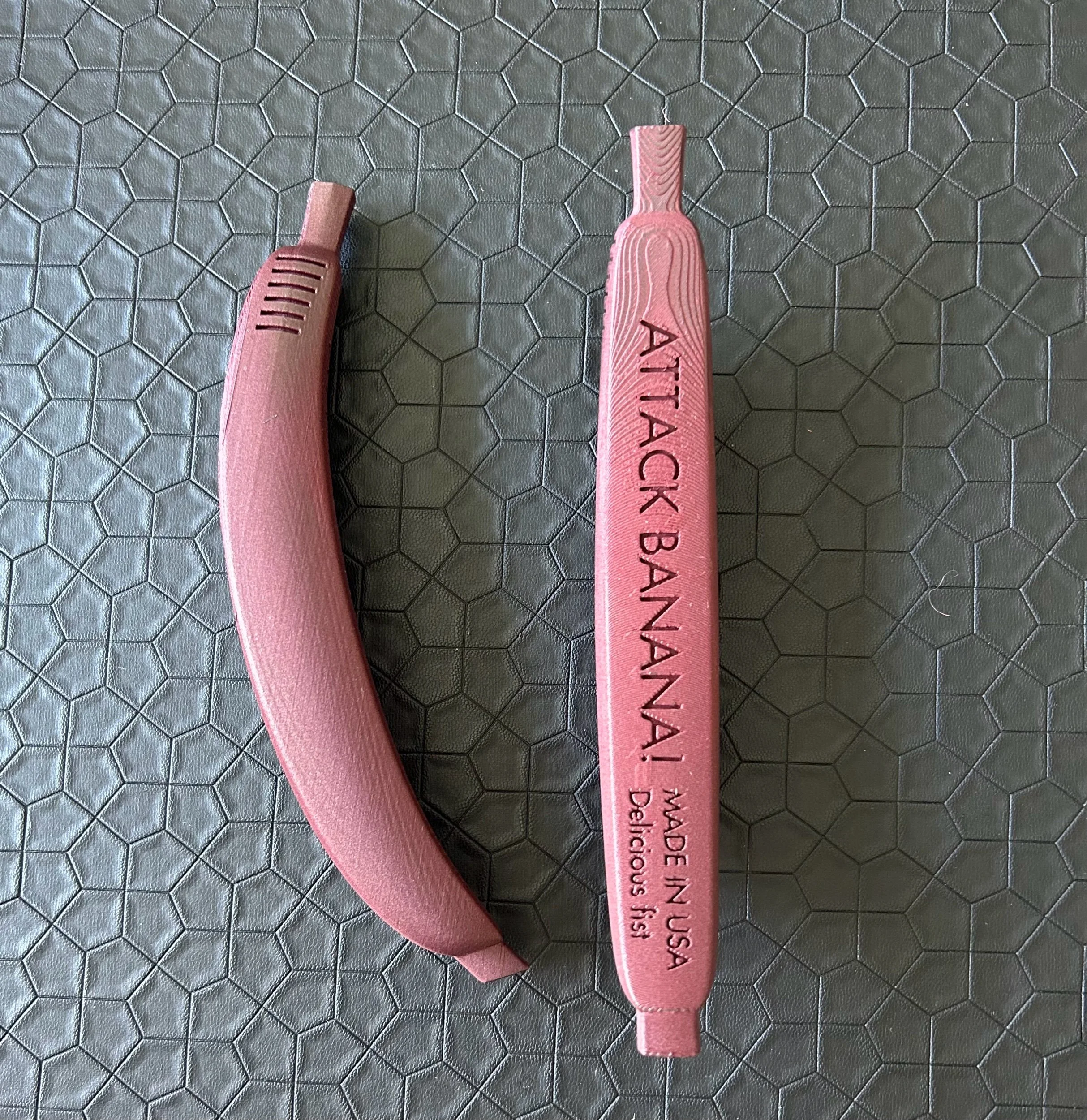 Image 1 of 1 Attack Banana $55.00 sold out Burgundy. These are 3D steel infused filament and are 7 “ over all length and weight 3oz Sold Out Added! Burgundy. These are 3D steel infused filament and are 7 “ over all length and weight 3oz