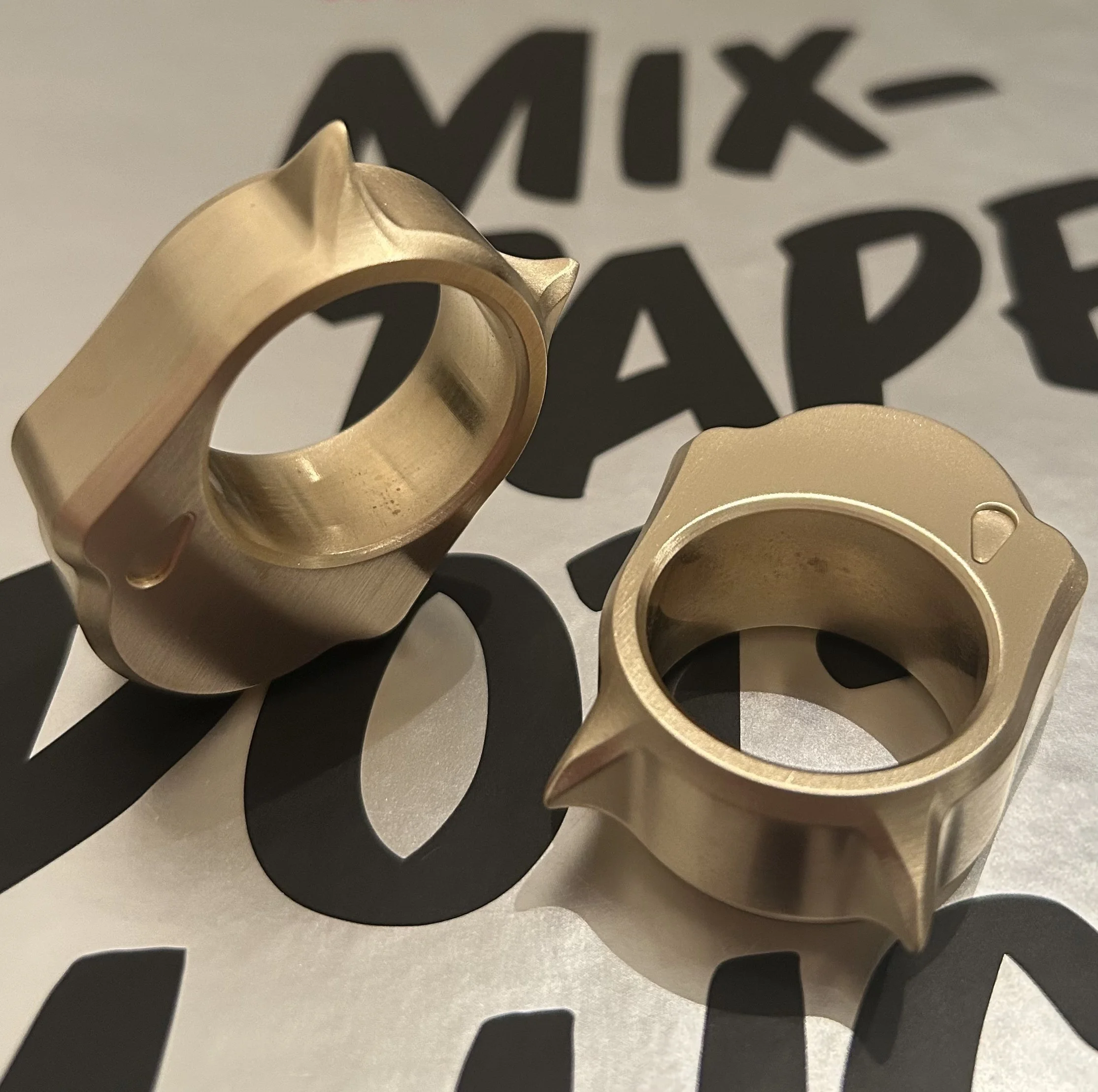 Image 1 of 1 Horny Ghost $165.00 Brass. 5/8” thick. 1” ring size. Satin finish. Tear drop logo. Add To Cart Added! Brass. 5/8” thick. 1” ring size. Satin finish. Tear drop logo.